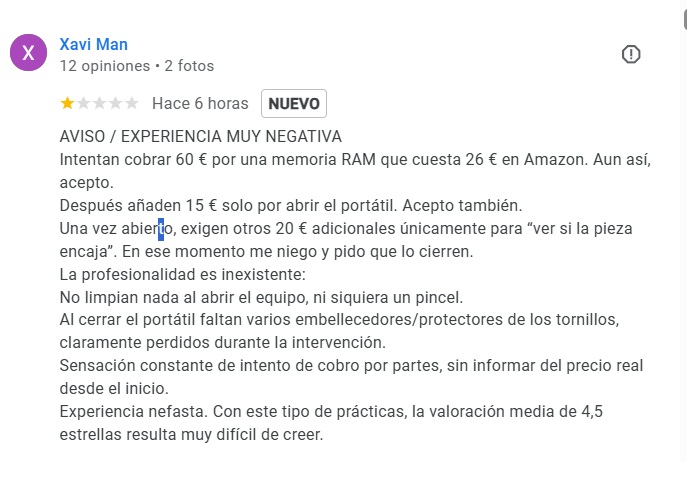Si sumamos que el portátil modelo Asus X555 era el mismo que una clienta que intentó reparárselo ella, rompió, pues al abrirlo si no tienes la profesionalidad suficiente, puedes romper el cable del teclado y del touchpad, y que esa clienta había acudido a tienda minutos antes buscando un cargador que ella pretendía que le vendiese al precio de internet, todo esta dicho. Búsqueda de crear una falsa situación para que los miserables como tú que no hacen mas que rabiar porque alguien como yo se gane bien la vida de forma honrada y con una excelencia profesional mas que demostrada, puedan tener excusa para desprestigiarle, todo ello por supuesto, y mira tu que casualidad, protagonizado por gente que de una forma evidente pertenece a esas clases bajas que mucho piden mucho quieren pero nunca dan nada.