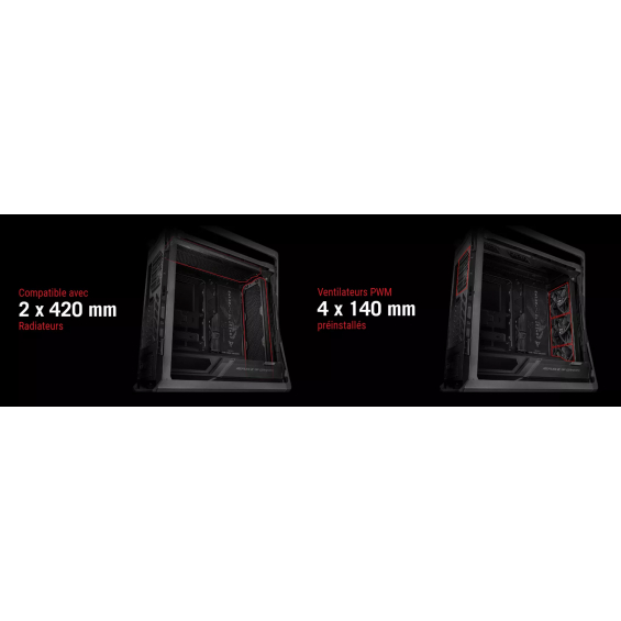 La ROG Hyperion GR701 BTF Edition aporta un factor X tanto en forma como en función que los constructores de todo el mundo han estado anhelando. Con soporte para dos radiadores de 420 mm, tarjetas gráficas imponentes, un soporte para tarjeta gráfica de aluminio bidireccional totalmente integrado, carga de dispositivo de 60 vatios y conectores USB-C frontales dobles para placas base ROG compatibles, es realmente un chasis de PC en el codiciado estilo ROG.