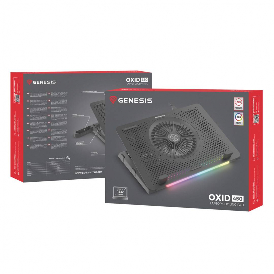 Genesis Oxid 450 RGB es un potente soporte de refrigeración para portátiles de 15,6" que cumplirá con las expectativas de los jugadores. El diseño único y los potentes ventiladores garantizan una refrigeración de alto nivel y, en consecuencia, una buena cultura de los componentes. ¿Bajas temperaturas? Es posible. Además, la Genesis Oxid 450 RGB está enriquecido con retroiluminación RGB, que le dará a su estación de trabajo un toque de juego.