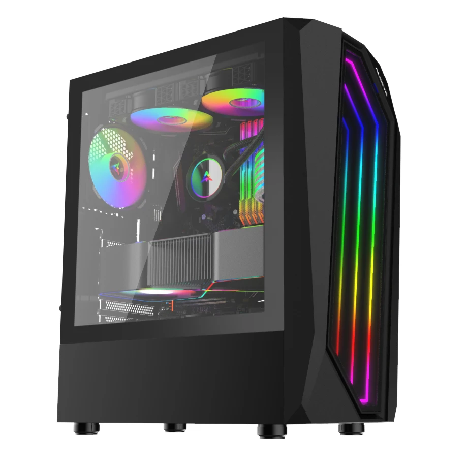 | Refrigeración por aire | Frontal: 120 mm x 3 o 140 mm x 2 (opcional) Superior: 120 mm x 2 o 140 mm x 2 (Incluye ventilador RGB direccionable x 2) Trasero: 120 mm x 1 (Incluye ventilador RGB direccionable x 1) |