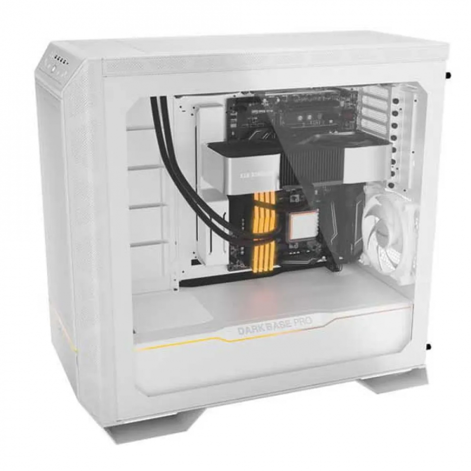 Y características convenientes. Dark Base Pro 901 White cuenta con iluminación ARGB en la parte frontal y la cubierta de la fuente de alimentación: las áreas iluminadas se eligen conscientemente para garantizar que el estuche permanezca elegante con una iluminación sutil. La configuración de la luz y el ventilador se puede controlar cómodamente a través de botones sensibles al tacto en el panel de E / S. Un cargador inalámbrico para dispositivos habilitados para Qi redondea perfectamente Dark Base Pro 901 White.
