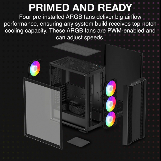 Cuatro ventiladores LED preinstalados ofrecen un gran rendimiento de flujo de aire, lo que garantiza que cualquier construcción de sistema reciba una capacidad de enfriamiento de primer nivel.