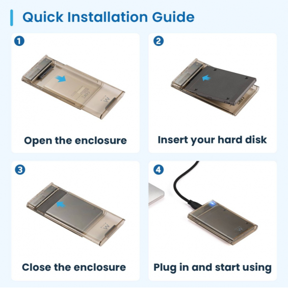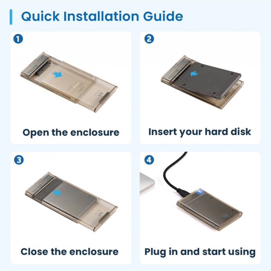 | Caracterí;sticas | - Formato de unidad: 2,5" - Interfaz de unidad: SATA - Sin tornillos: Sí; - Material de la carcasa: ABS de alta calidad - Conexió;n a ordenador: USB A macho (x1) - Funciones compatibles: UASP - Versió;n USB: USB 3.2 Gen1 5 Gbps - Velocidad de transferencia de datos: 5 Gbps Dimensiones - 125,7 x 78 x 13,6 |