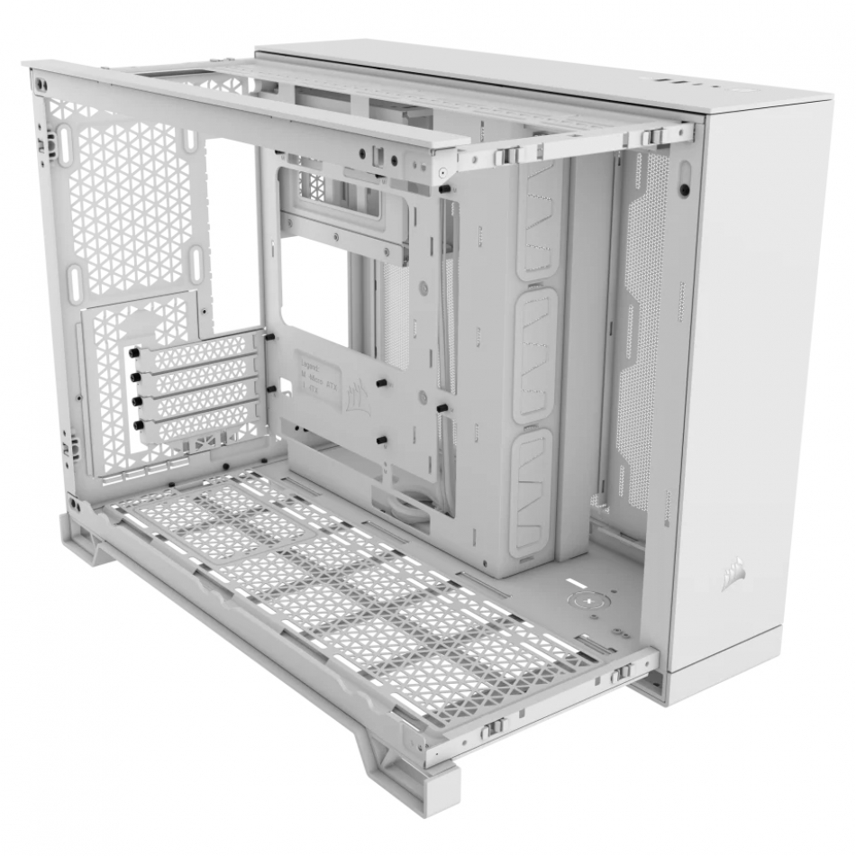 El chasis para PC de dos cámaras micro-ATX CORSAIR 2500X ofrece una vista despejada y organizada de su PC de formato pequeño gracias a los paneles frontales dobles de cristal templado. Disfrute de un aspecto despejado con una cámara específica para cables, discos duros y controladores. El pequeño tamaño del 2500X esconde varias opciones para el sistema de refrigeración, con espacio para hasta 9 ventiladores de 120 mm o 4 de 140 mm y opciones versátiles de montaje del radiador en la parte superior, inferior y lateral. La compatibilidad con placas base de conexión inversa consigue que los cables del sistema queden fuera de la vista. El sencillo montaje de unidades sin herramientas permite colocar 2 unidades de almacenamiento de 3,5 pulgadas o 2 de 2,5, mientras que la moderna E/S del panel frontal, con USB 3.2 Gen-2 Type-C, ofrece un cómodo acceso al dispositivo. El 2500X, diseñado para la simplicidad y con varias opciones de personalización, garantiza que su PC de pequeño formato tenga el mejor aspecto y funcione a pleno rendimiento