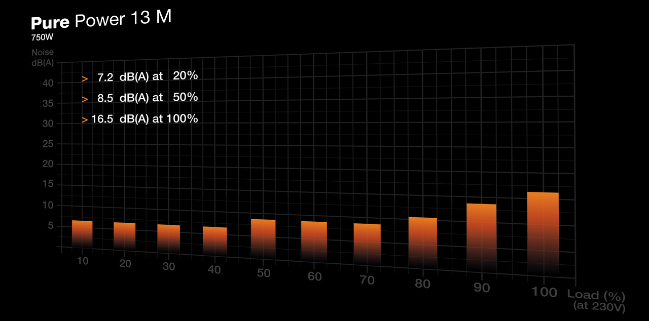 Pure Power 13 M 750W cuenta con la certificación 80 PLUS ® Gold y un extraordinario índice de eficiencia de hasta el 94,3 %. El beneficio más convincente: menor consumo de energía, en consecuencia, menores costes y, sobre todo, un funcionamiento más fresco y silencioso. ¡Pure Power 13 M 750W es siempre la elección correcta para sistemas silenciosos y PC para juegos!