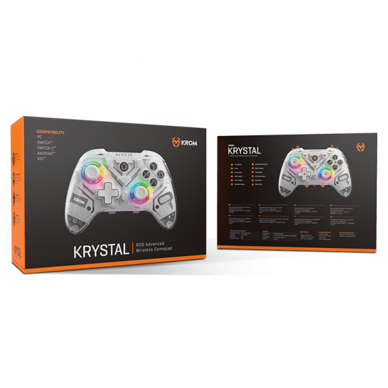 Disfruta de tus títulos favoritos en PC, Switch™, Switch™ 2 o smartphones con Krom Krystal. Este mando profesional de Krom incluye un receptor wireless para que puedas utilizarlo de manera inalámbrica, mediante Bluetooth 5.0, cuando quieras jugar en tu ordenador y un cable USB Tipo C a USB para que no pierdas ni un segundo de tus partidas.