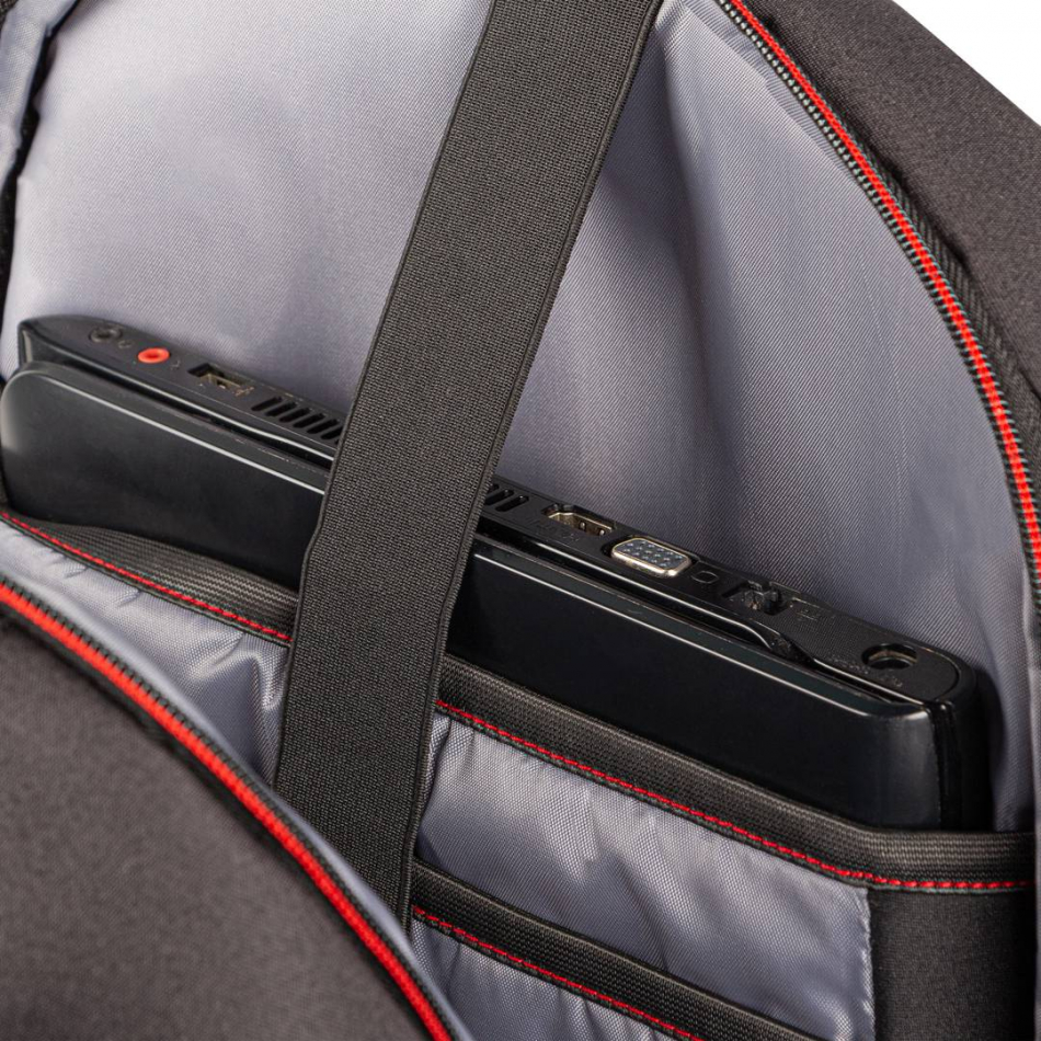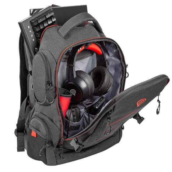 El espacioso interior de la mochila permite llevar un portátil de 17,3 pulgadas y todos los accesorios necesarios para el próximo torneo de gaming. El diseño extremadamente resistente y robusto garantiza la total seguridad del equipo transportado.
