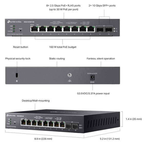Características de Hardware | - Interfaz: 8 × 100/1000/2500 Mbps RJ45 PoE+ Ports 2 × 10G SFP+ Slots - Cantidad de ventiladores: Fanless - Bloqueo de Seguridad Física - Fuente de Alimentación: Adaptador de Corriente 53.5VDC/3.37A - Puertos PoE (RJ45) Estándar: compatible con 802.3at/af Puertos PoE+: 8 puertos Presupuesto de energía PoE: 160 W - Montaje: Sobremesa/Pared - Consumo de Potencia Máximo: 180,1 W (110V/60Hz) (con 160 W PD conectado) - Disipación máxima de calor: 614,58 BTU/hr (110 V/60 Hz) (con 160 W PD conectado) - Dimensiones: 226 × 131 × 35 milímetros |