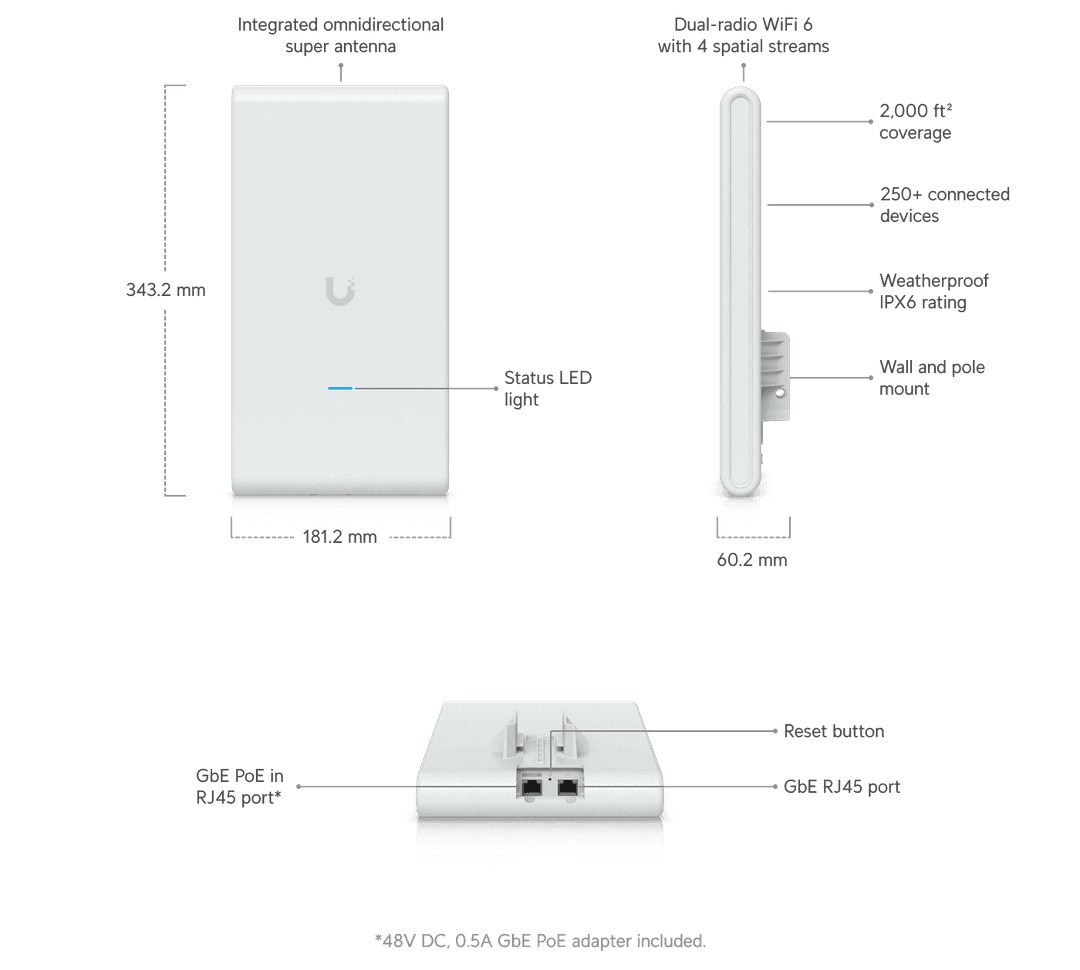 Punto de acceso WiFi 6 para interiores y exteriores con 4 transmisiones espaciales, una súper antena integrada y un puerto de paso gigabit.